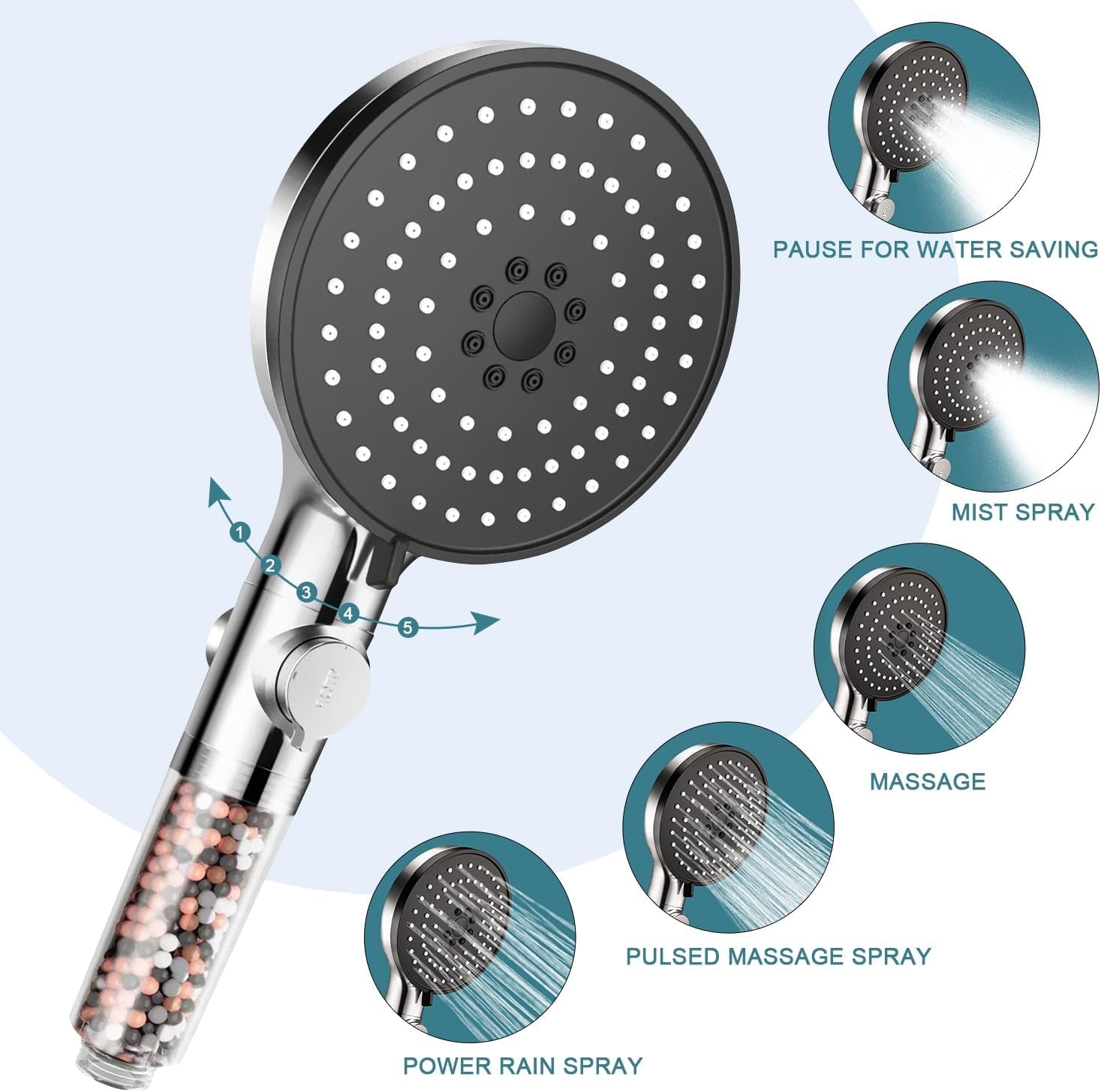 High-Pressure Mineral Shower Head with Bead Filter | 5 Spray Modes + Pause Function | Includes 70" Hose & Bracket
