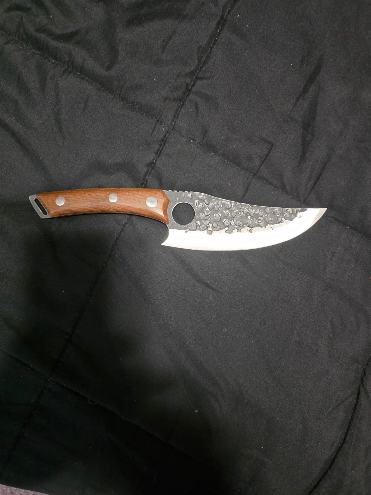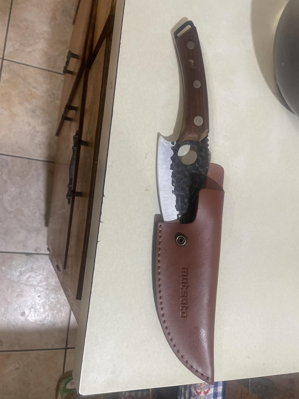 Good looking knife nice and sharp. Cuts through meat, pretty good. Looks like it's made of decent steel price was fair the weight is pretty good, not having. That's a good blade