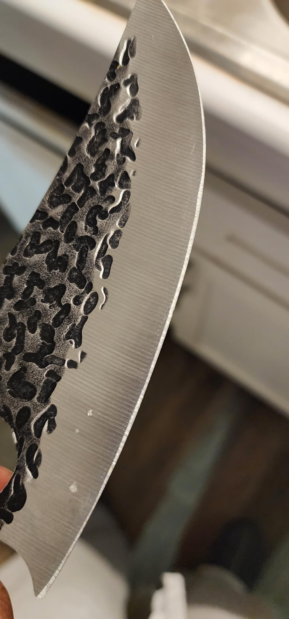 chef knife is very sharp, well-balanced, and comfortable to use. It cuts smoothly through meat, vegetables, and fruits. The handle feels solid and high-quality. For the price, this knife is excellent and looks premium. I'm very satisfied with this purchase.